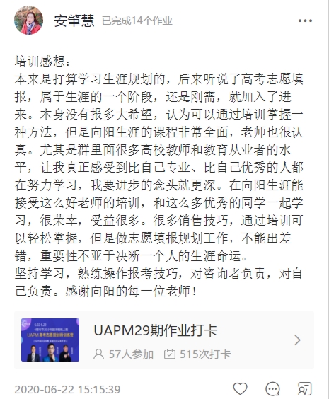 很快地,向阳生涯的第29期新高考志愿规划师培训就要结束了。通过这二十多天老师的教导和我自己的学习,使我获益匪浅,收获多多。具体地,主要有以下几点体会: 1、学到了很多知识 通过学习,使我学习到了很多以前我自己不了解的有关高考志愿填报和新高考的知识。 2、掌握了很多技巧 通过老师的教导,使我掌握了很多只有在实践应用在才能领会到的技巧和方法。 3、感恩老师们的认真教导 在这次的学习过程中,无论是洪老师,还是欧阳老师、张老师,老师们都非常认真,教知识、传技巧、解疑惑、指问题、细点评,信息量多,干货满满。 4、感谢向阳生涯的精心组织 说实在的,在社会上有很多培训机构只关注收钱,在组织实施上用心不多。但此次培训中,我感觉到向阳生涯非常认真对待,精心组织,无论是从培训内容体系,还是邀请真正行业大咖来授课,都确实感觉到了向阳生涯的用心。
